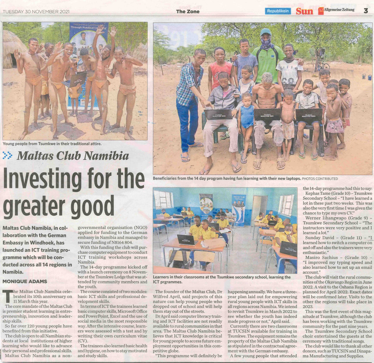 Maltas Club Namibia in collaboration with the German Embassy in Windhoek, launched an ICT Training Programme which will be conducted across all 14 Regions in Namibia.