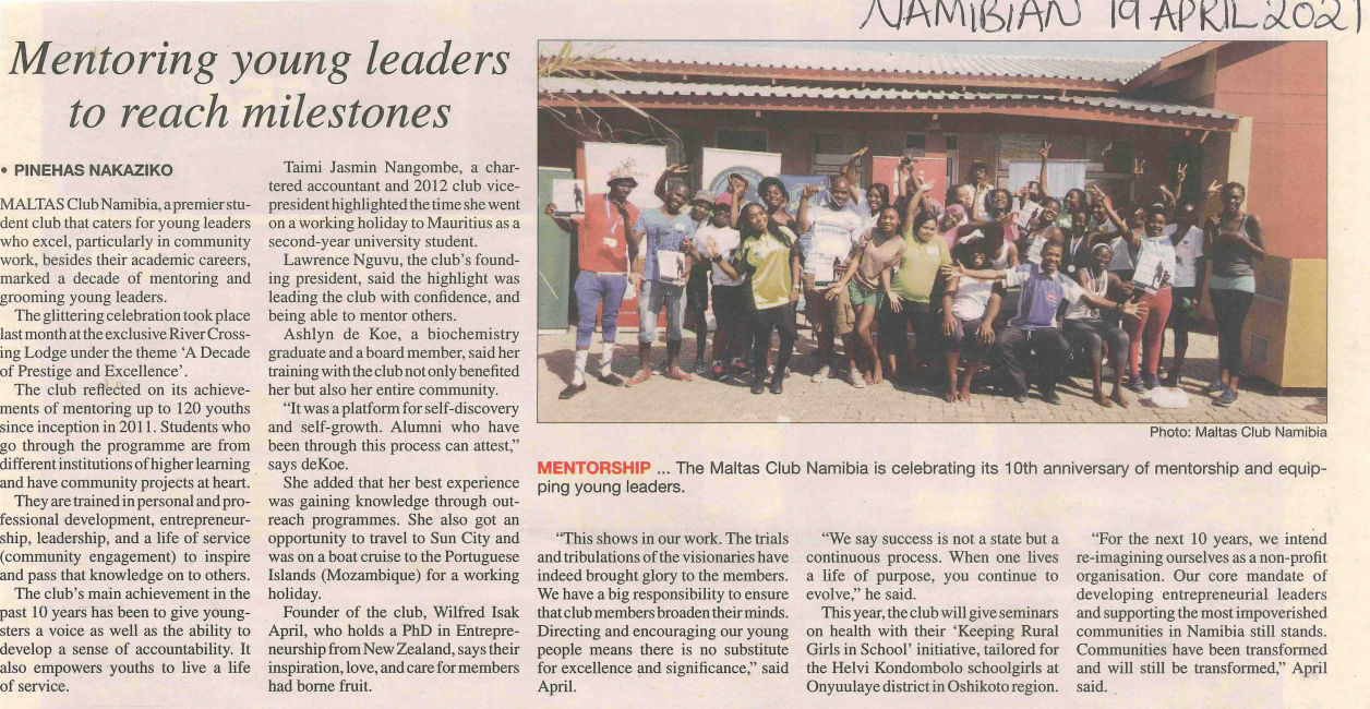 Maltas Club Namibia (MALTAS) celebrated its 10th anniversary on 11 March this year and is a registered NGO with the Ministry of Industrialisation, Trade, and SME development in the Republic of Namibia. The core mandate of Maltas Club Namibia is a premier student club that empowers young Namibian students at institutions of higher learning in entrepreneurship, innovation, and leadership skills. Thus far over 120 young people benefited from this initiative and are making their mark in the national and international space across the globe.